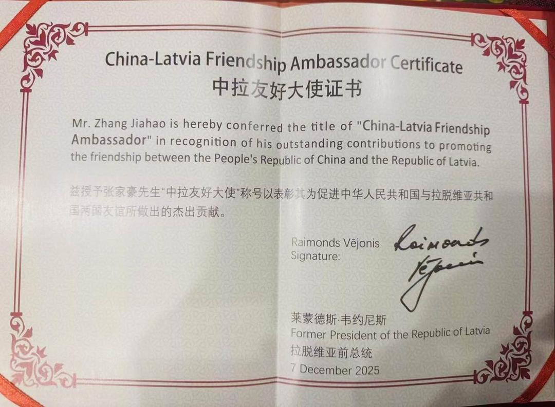 Dr. Zhang Jiahao, an investor who has long promoted cooperation between Central and Eastern Europe and the world, and the Chairman of the European, American and Chinese Investment Promotion Association (EACIPA), has been awarded the title of "China Latin America Friendship Ambassador" in recognition of his efforts to build bridges for industrial cooperation and development opportunities between the two countries through the concept of "temperature capital" and global practice networks.