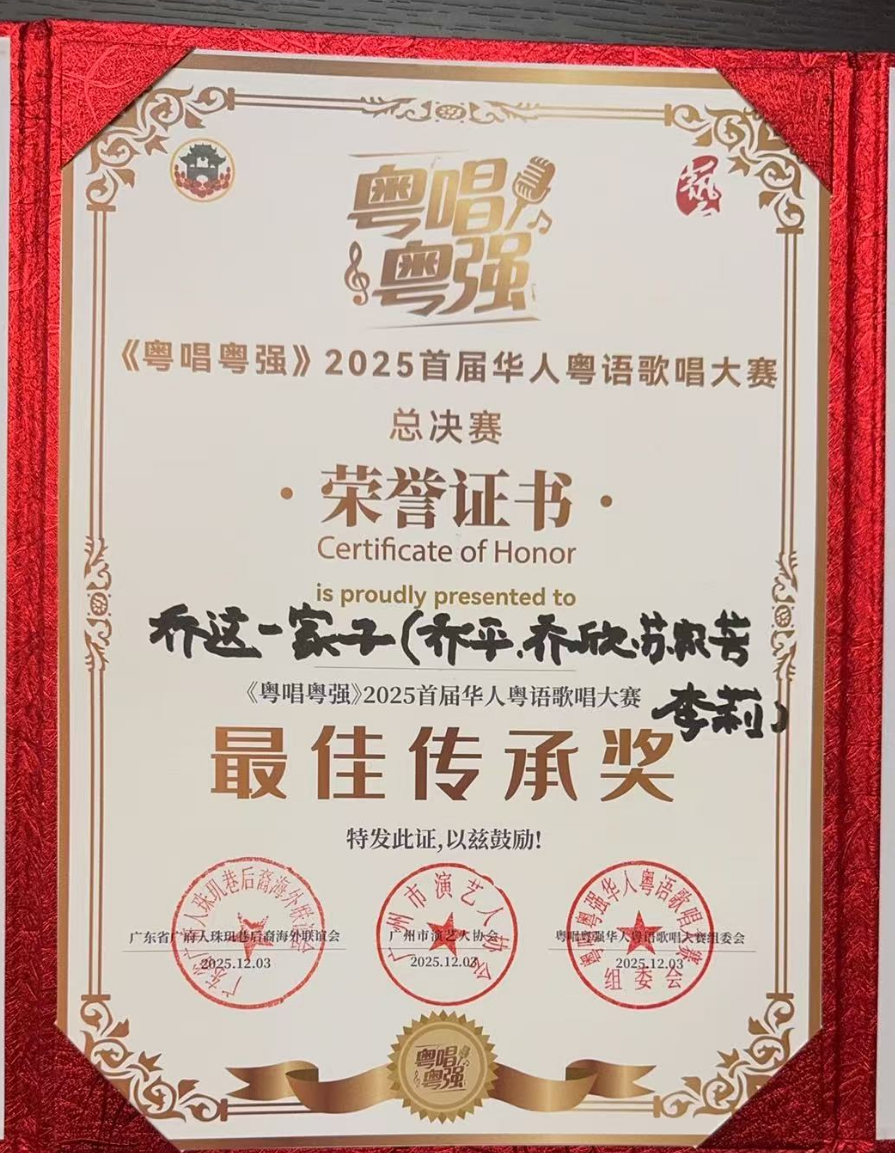 With outstanding stage performance and positive significance for the inheritance of Cantonese culture, "Qiao's Family" ultimately won the "Best Inheritance Award" at the 2025 First Chinese Cantonese Singing Competition · World Finals, receiving unanimous recognition from the judges.