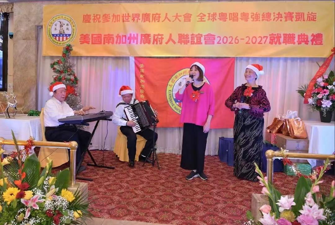 After returning from Guangzhou, China with honors, the Southern California participating group "Qiao's Family" was invited to participate in the inauguration and Christmas New Year celebration of the Southern California Cantonese People's Association. They presented a wonderful performance at the party, including a choir, a female duet, and a male duet. The atmosphere was lively and won warm applause from guests, once again showcasing their profound Cantonese music heritage and stage charm.